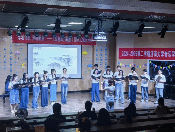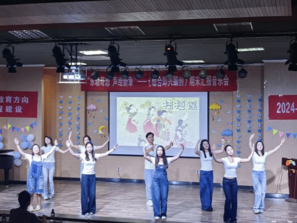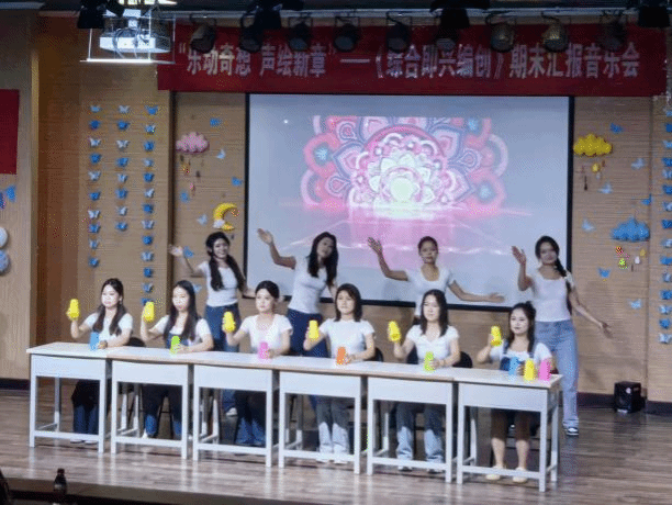 本场音乐会通过四个不同的篇章,有如微电影一般的方式呈现各个节目,带领观众踏上了一段奇幻的音乐之旅。序幕以AI软件制作的配乐搭配音乐硕2301全体同学的排练场景的花絮为整场音乐会奠定了前沿的基调,歌词富有巧思,融入了各节目的名称。进入篇章一“童趣初绽”,杯子舞《本草纲目》+《最炫民族风》以奥尔夫声势为基础,在其轻快的音乐下设计不同节奏的杯子动作,加入音乐动作设计形成多声部互动的概念。“身体打击乐”串烧节目挑选了三首不同风格的中小学音乐课本歌曲《桔梗谣》《踏雪寻梅》《卡门序曲》,用身体演绎音乐的无限可能。“音乐游戏”串烧节目选择音乐课堂中常见使用的道具彩带、呼啦圈、球、丝巾,通过游戏设计,提升对音乐的感知力,以及身体的协调性、灵活性和节奏感,通过集体协作,展现音乐游戏在音乐课堂中运用的独特魅力和艺术效果。《山鬼》三声部合唱改编,以楚辞《山鬼》为基底,展现音乐与文学融合的美妙,感受传统文化在现代艺术形式下的独特魅力,有着跨越时空的情感力量,增强对中华传统文化的认知与情感共鸣。