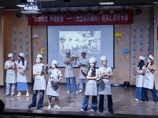 随着篇章二“诗韵流芳”的展开,民乐合奏《茉莉花》以视频解说的形式展现了江南的“吴侬软语”以及东北的“激情豪迈”。从南至北,同一茉莉花展现出不同的风情。音硕2301将《茉莉花》改编,以琵琶、竹笛为主旋律,与钢琴四手联弹相呼应,辅以舞蹈,展现了《茉莉花》的别样风情。原创器乐合奏作品《群山回响》采用AI生成视频,以电影配乐的概念形式唤起彝族村落族人对自然的敬畏。经典宫崎骏动画旋律改编的三首钢琴四手联弹:《菊次郎的夏天》以轻快的步伐描绘夏日的欢乐;《人生的旋转木马》借悠扬的曲调叙述人生故事;《那一天的河川》以舒缓的旋律唤起情感回忆。配合动画剪辑,在熟悉的旋律中重温经典场景,沉浸在音乐构建的奇幻世界中。创意打击乐重奏《厨房大作战》结合情境设定,用矛盾与和解“烹饪”音乐,锅碗瓢盆化身为乐器,争吵与和谐皆转化为节奏!在这里,金属与木头的碰撞成为旋律的争执,水壶的沸腾成为和解的信号,切菜声、敲打声、摩擦声……所有“厨房噪音”,最终熬成一锅沸腾的打击乐盛宴!