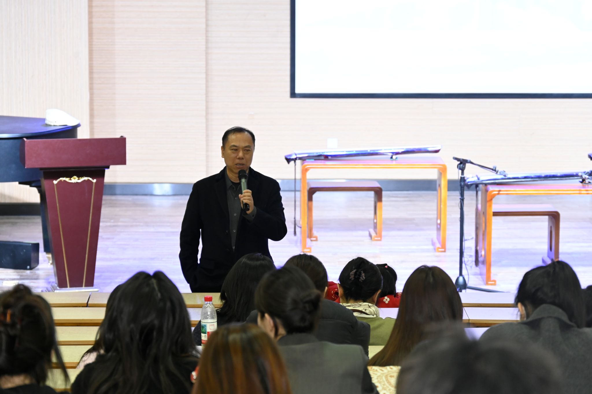 当晚,到2教101来聆听的观众人数众多,整个大厅洋溢着美育的魅力与和谐。活动开始前,王建成教授致欢迎辞,介绍了主讲嘉宾,详细解释了ok138cn太阳集团529举办齐鲁音乐文化讲坛的目的。他提到增强文化自信、传承中华文化的重要性,强调古琴作为传统乐器承载着深厚的历史文化,希望同学们加深对古琴艺术的理解,体验其艺术魅力,增强对传统文化的认同感和自豪感。