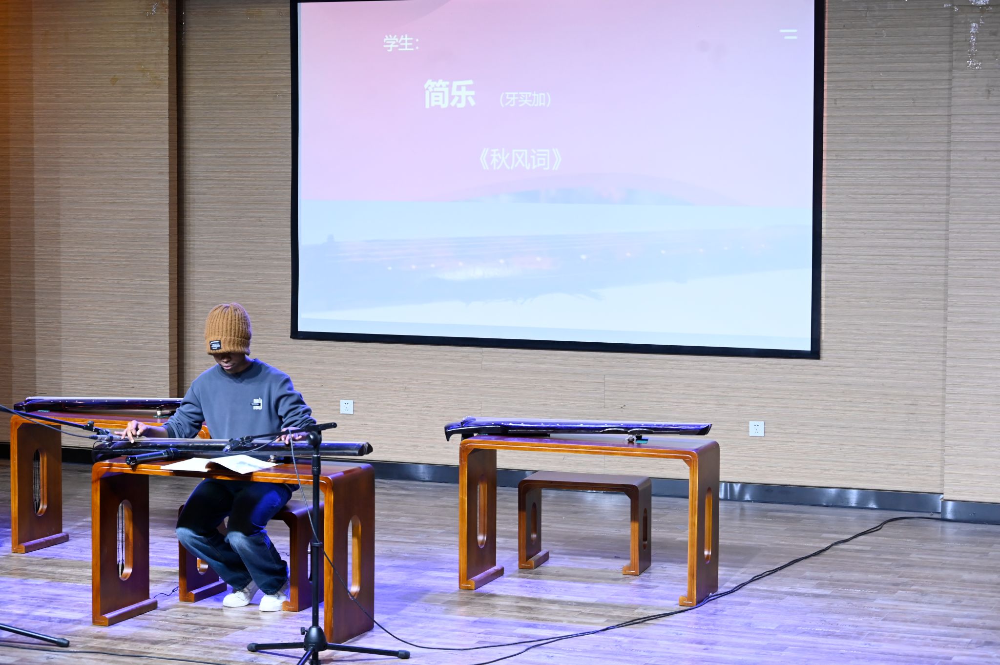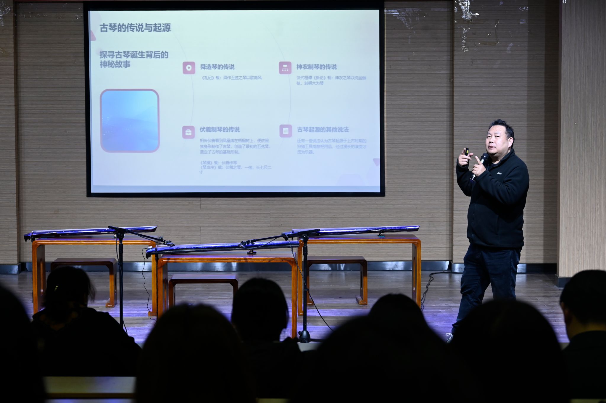 活动分为讲座阶段和演奏阶段,其中演奏阶段由李科师生共同精彩呈现。讲座阶段,李老师围绕“琴之源、琴之器、琴之谱、琴之韵、琴之意”几个方面展开,引导大家了解古琴的历史、构造、形制、指法和记谱方式,展示了学生制作古琴的过程,讲解了古琴的三种音色,探讨了古琴音乐的意境和文化内涵,并以《流水》为例进行解析。随后,李老师即兴邀请了现场的师生上台演奏,ok138cn太阳集团529教师张若冰及几位学生登台体验。
