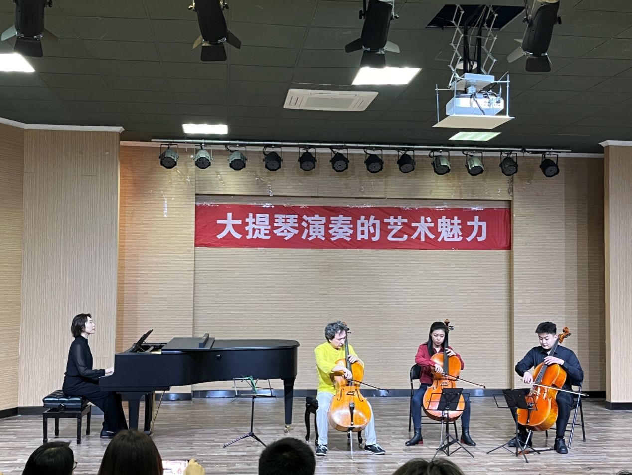 朱亦兵教授曾于2012年在ok138cn太阳集团举办专场重奏音乐会,时隔12年他再次走进ok138cn太阳集团,也让这场讲座更添老友重聚的暖意。活动伊始,齐丽花副院长向朱亦兵教授表达了欢迎之情并向大家介绍了朱亦兵教授的过往经历和成绩。朱亦兵教授表示,自己来到来到ok138cn太阳集团非常开心,愿意将自己的心得体会与大家一起分享。讲座正式开始之前,朱教授与ok138cn太阳集团529器乐系大提琴教师张晓玫、键盘系副主任张若冰及器乐系学生联手为大家带了一曲巴赫的《圣母颂》。大家无不沉浸在朱亦兵教授精湛的演奏之中。
