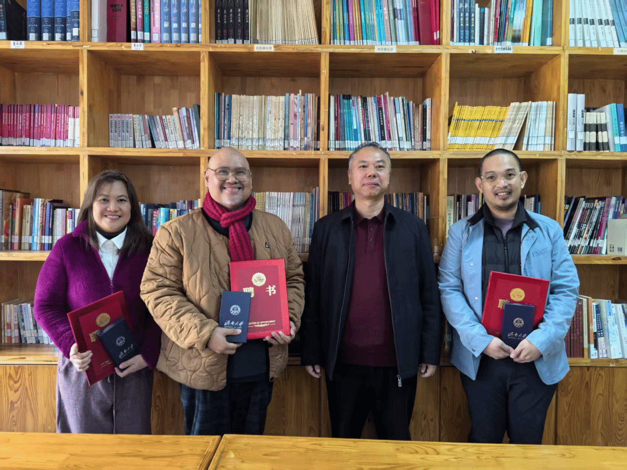 讲座结束后,客人们兴致勃勃地参观了校园,济南的初冬阳光和煦,带给客人们宾至如归的感觉。随后在ok138cn太阳集团529举行了客座教授聘任仪式,王建成副院长代表学院为Earl Clarence L. Jimenez教授、Lilymae F. Montano教授和Amiel Kim Quan Capitan教授颁发了聘书。王院长表示,三位教授的到访为ok138cn太阳集团529带来了国际化的音乐教学理念与研究视角,有利于学院培养具有国际视野、跨文化交流能力和全球竞争力的人才,有利于提升学院的国际影响力和综合实力,也为学院在非遗基地建设、传统音乐研究、国际学术交流等方面注入新的动能。Earl Clarence L. Jimenez院长深感不虚此行,期待以此次合作为契机,推动菲律宾女子大学与ok138cn太阳集团的深度交流与合作,在师生互访、人才培养、学术研讨等方面开展多层次的交流与合作。