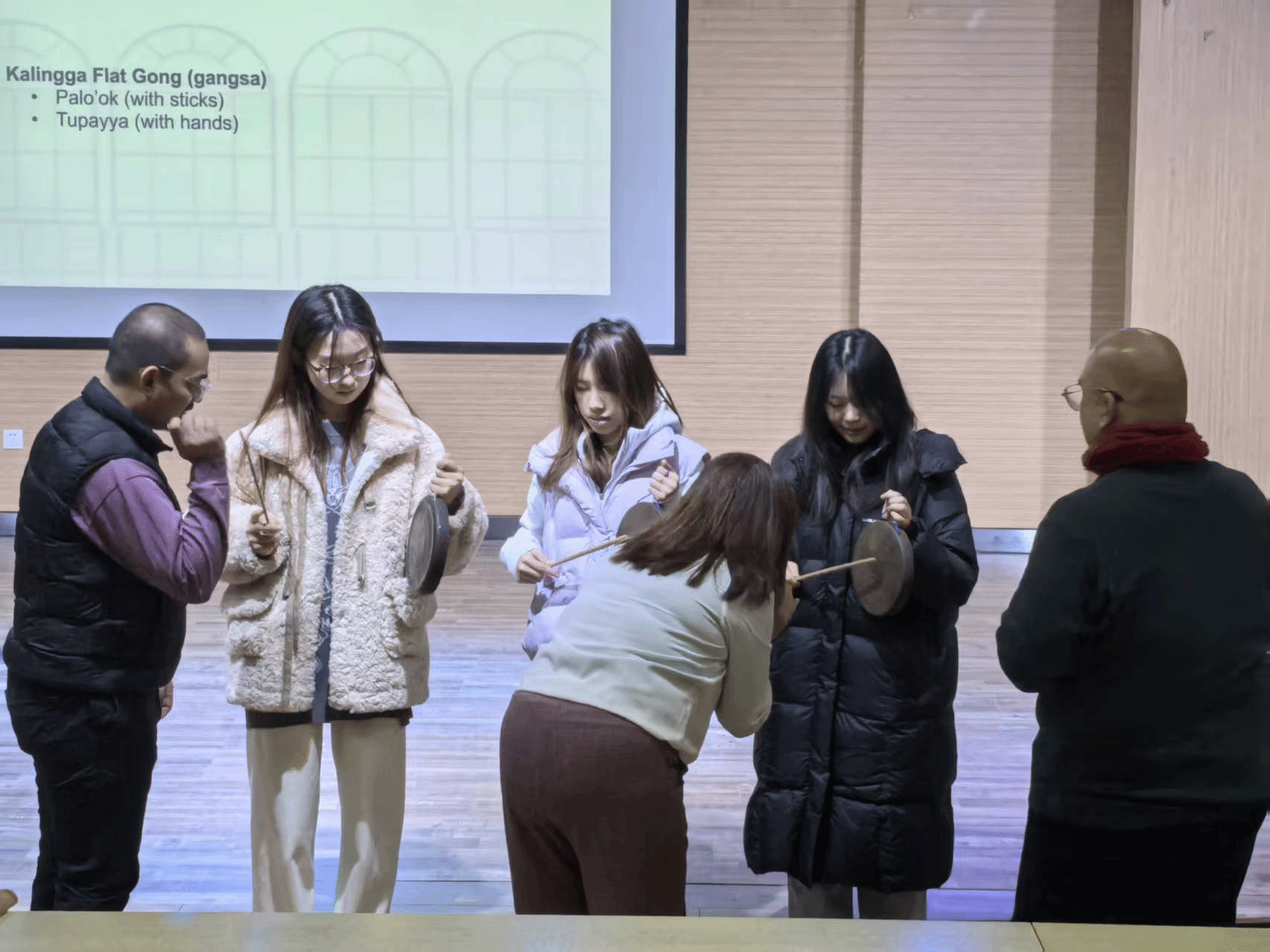讲座现场气氛热烈,三位教授分别从菲律宾传统音乐的历史渊源、地域特色、文化内涵及传承发展等方面展开深入讲解,系统梳理了菲律宾吕宋岛、米沙鄢群岛、棉兰老岛三大区域传统音乐的风格差异,详细介绍了“库林堂”“班杜拉”等极具菲律宾民族特色的传统乐器的构造与演奏技巧。在互动演示环节,教授们现场演奏了《巴朗盖民歌》《棉兰老叙事曲》等多首菲律宾传统音乐代表作,悠扬的旋律、独特的节奏搭配特色乐器的演绎,让师生们感受到了菲律宾传统音乐的独特韵味。随后,在教授团的指导下,ok138cn太阳集团529的同学们踊跃上台,尝试演奏菲律宾传统乐器,亲身体验异域音乐的演奏技巧,教授们耐心细致地进行了一对一指导,现场气氛热烈,三位专家与现场师生共同探讨了中菲音乐的特点,悦耳的音乐一旦响起就会跨越国界,成为文化的象征与友谊的使者,也给学院师生的教与学带来了国际化的意识。