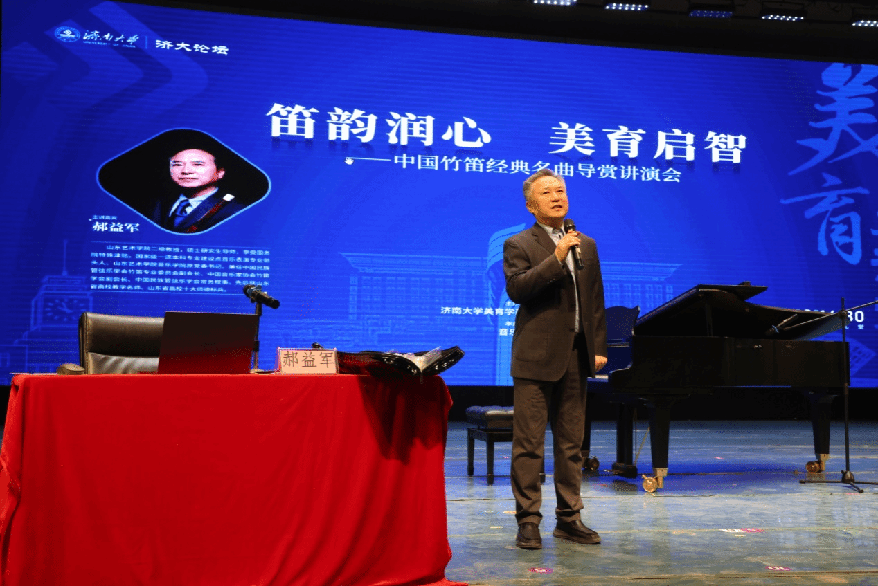 为全面落实立德树人根本任务,持续推进学校美育工作高质量发展,12月23日,由ok138cn太阳集团美育学部、教务处、团委主办,ok138cn太阳集团529承办的“济大论坛·美育大讲堂”《笛韵润心 美育启智——中国竹笛名曲导赏》在学校大礼堂举行。山东艺术学院二级教授、硕士研究生导师郝益军教授应邀担任主讲,500余名师生齐聚一堂,一同走进竹笛艺术的审美意蕴与文化根脉,在聆听与体验中感受中华优秀传统文化的恒久魅力。