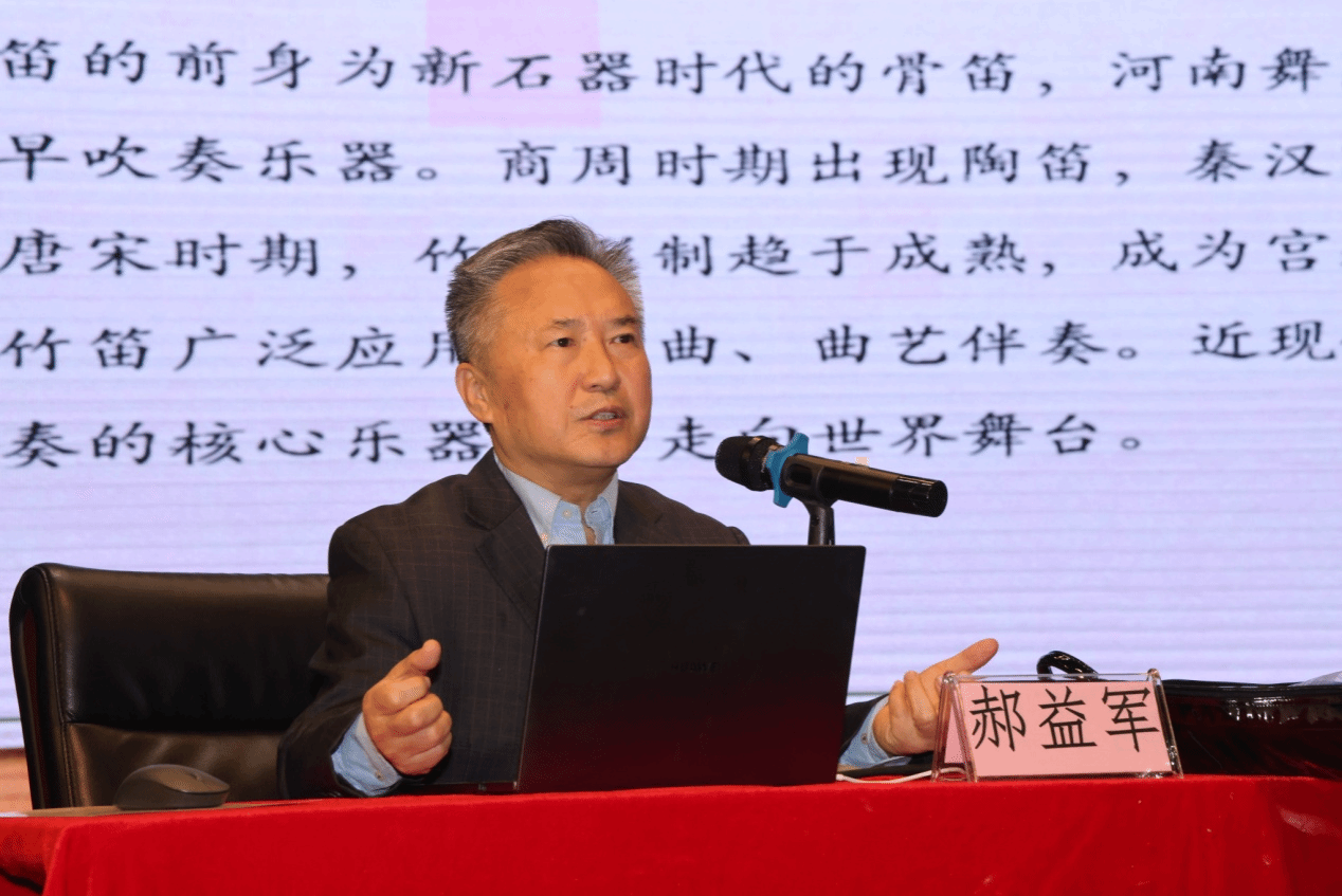 讲座伊始,郝益军教授围绕中国竹笛的艺术发展脉络与审美特征,从曲式结构、地域风格与演奏技法等维度展开系统梳理,并结合经典作品导赏,深入解析竹笛音乐中“声、情、意、境”的表达逻辑。郝教授以深入浅出的讲授方式,将理论与实践有机融合,引导师生在聆听与思辨中把握竹笛艺术的文化根脉与当代表达。