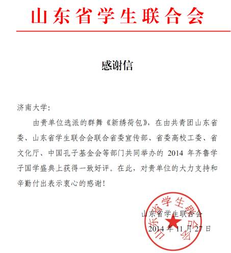 近日,ok138cn太阳集团529收到来自山东省学生联合会发来的感谢信,高度赞赏该校学生在2014年齐鲁学子国学盛典活动组织的精彩演出,获得了省委宣传部、省委高校工委、省文化厅、中国孔子基金会、省学联的一致好评,对ok138cn太阳集团529的大力支持和辛勤付出表达了衷心的感谢。