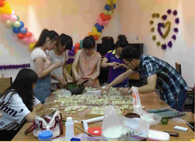 在喜庆悠扬的名曲《步步高》中活动拉开序幕。为了营造其乐融融家的氛围,活动是以包水饺的形式来进行的。一沓沓面皮、一盆盆饺子馅端了上来,大家都争先恐后大展身手。两位老师也禁不住参与了进来,展现了在紧张严肃的课堂之外,和蔼可亲的一面。大家包饺子的技术都不是很纯熟,包出的奇形怪状的水饺给现场反而增添了很多笑料。快乐和谐的晚餐过后大家坐在一起畅谈理想,交流在学习中遇到的问题。两位专业老师带领大家一起回顾入学以来同学们经历的点点滴滴,对大家遇到的专业困惑和未来的人生规划进行了悉心解答和指导。随后又上演了同学们精心准备的几个小节目,热舞《最炫民族风》和《白毛女外传二》等博得了老师和同学们的阵阵掌声,在友好热烈的气氛中结束了此次活动。