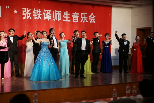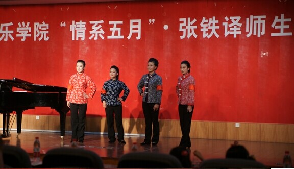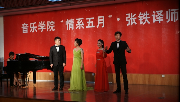 声乐表演硕士张铁译老师带领他的学生同台献艺,用歌声为爱乐者带来了一场优雅的视听享受。音乐会名曲汇集,分别演绎了由新疆民歌改编的男生四重唱《阿拉木汗》和《大阪城的姑娘》,幽默诙谐的表演方式,轻快的旋律和明朗的节奏,展示着音乐学子的青春与阳光。男女二重唱《在那小河淌水的地方》,演唱者以质朴的歌词,细腻的感情,充分表现作品的活力与纯情,获得了听众的青睐。混声四重唱《想亲亲》、《瑶山夜歌》充满了浓郁的民族风情。歌曲《乡谣》的演唱更是激动人心,丰富的剧情加上动听的歌声,达到焕然一新的视听效果。《一抹夕阳》、《情歌》、《啊,我的虎子哥》等众多民族歌剧咏叹调一一涌现,使现场笼罩在高雅的艺术氛围中。音乐会尾声,张铁译还特邀民族声乐表演艺术硕士、副教授贾婕作为表演嘉宾,共同演唱了《饮酒歌》,将音乐会现场推向了高潮,为本次师生音乐会画上了完美的句号。