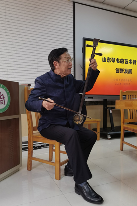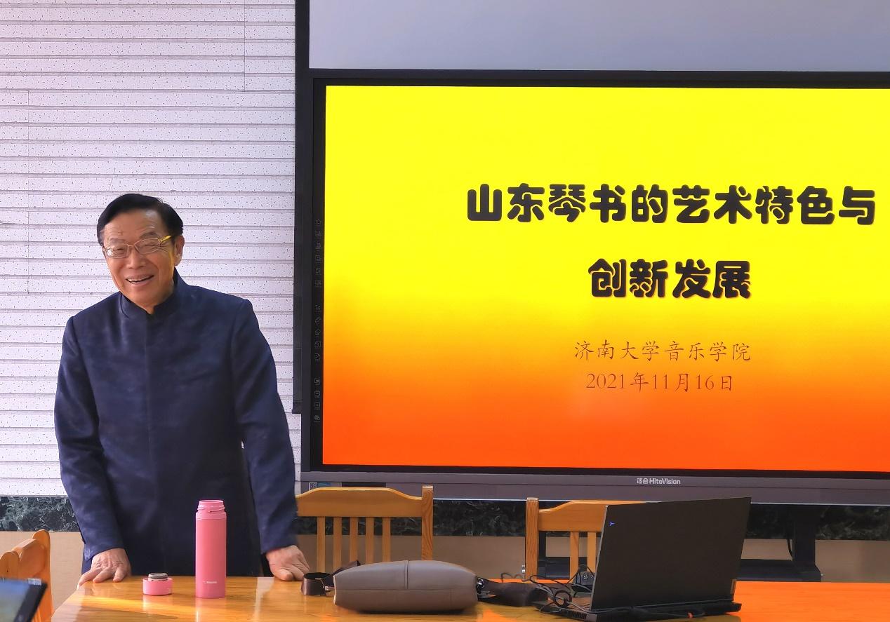 11月16日下午,应ok138cn太阳集团529邀请,我国山东琴书表演艺术家姚忠贤先生来ok138cn太阳集团529举办了《山东琴书的艺术特色与创新发展》学术讲座。讲座采取线上、线下相结合的形式进行,由音乐教育系系主任杨瑞教授主持,郑中院长、王建成副院长及音乐教育系全体教师、2021级研究生及部分本科学生代表参加了此次活动。