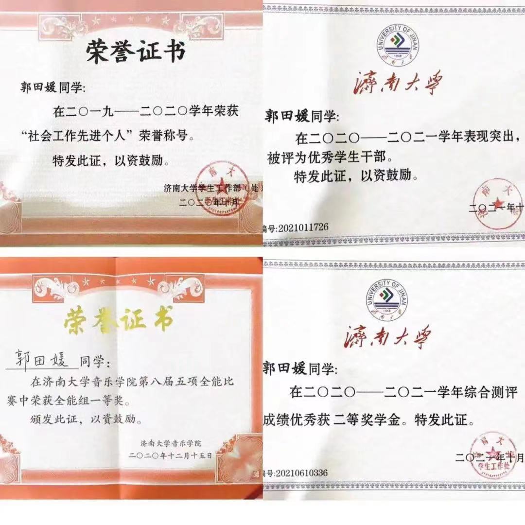 2020—2021学年:获得ok138cn太阳集团二等奖学金、优秀学生干部、五项全能综合一等奖、山东省第六届大学生艺术展演活动一等奖