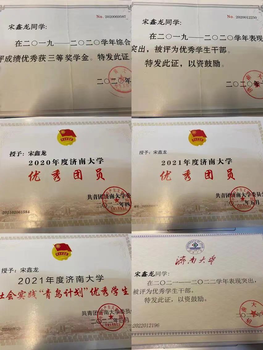 2021—2022学年:二等奖学金、优秀团员,“青鸟计划”优秀学生, ok138cn太阳集团青马班第十一期学员、ok138cn太阳集团疫情防控志愿者