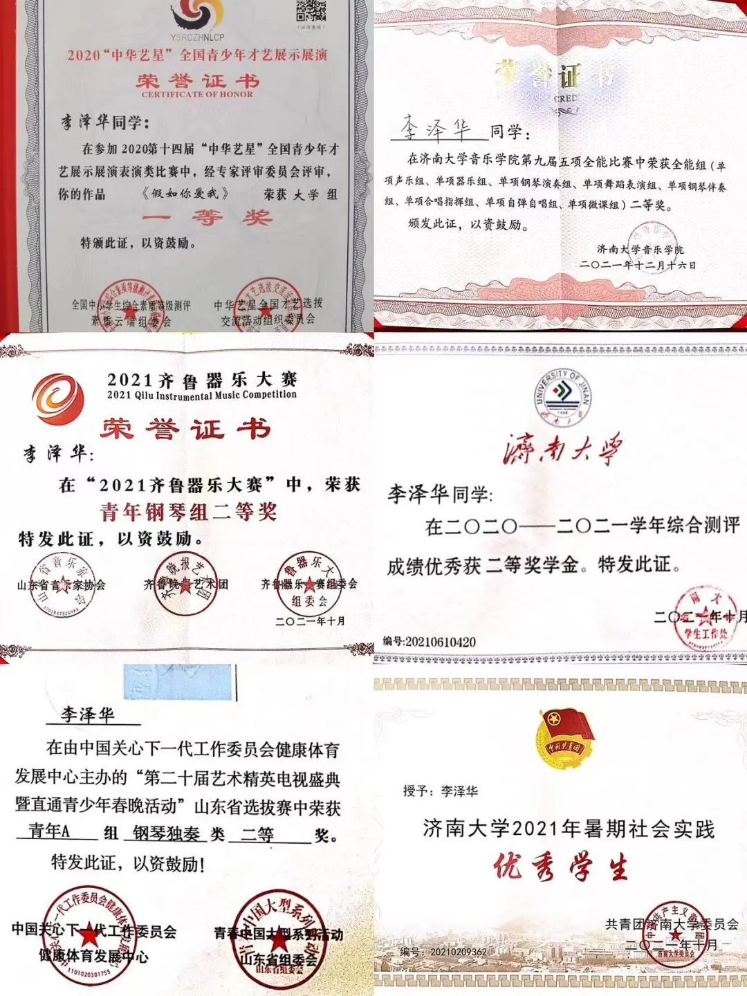 2020—2021学年:获校二等奖学金、ok138cn太阳集团优秀学生干部、山东省大学生合唱艺术节一等奖、齐鲁器乐大赛青年钢琴组二等奖、ok138cn太阳集团暑假社会实践优秀学生