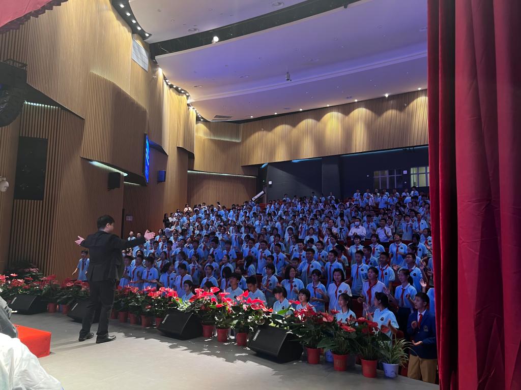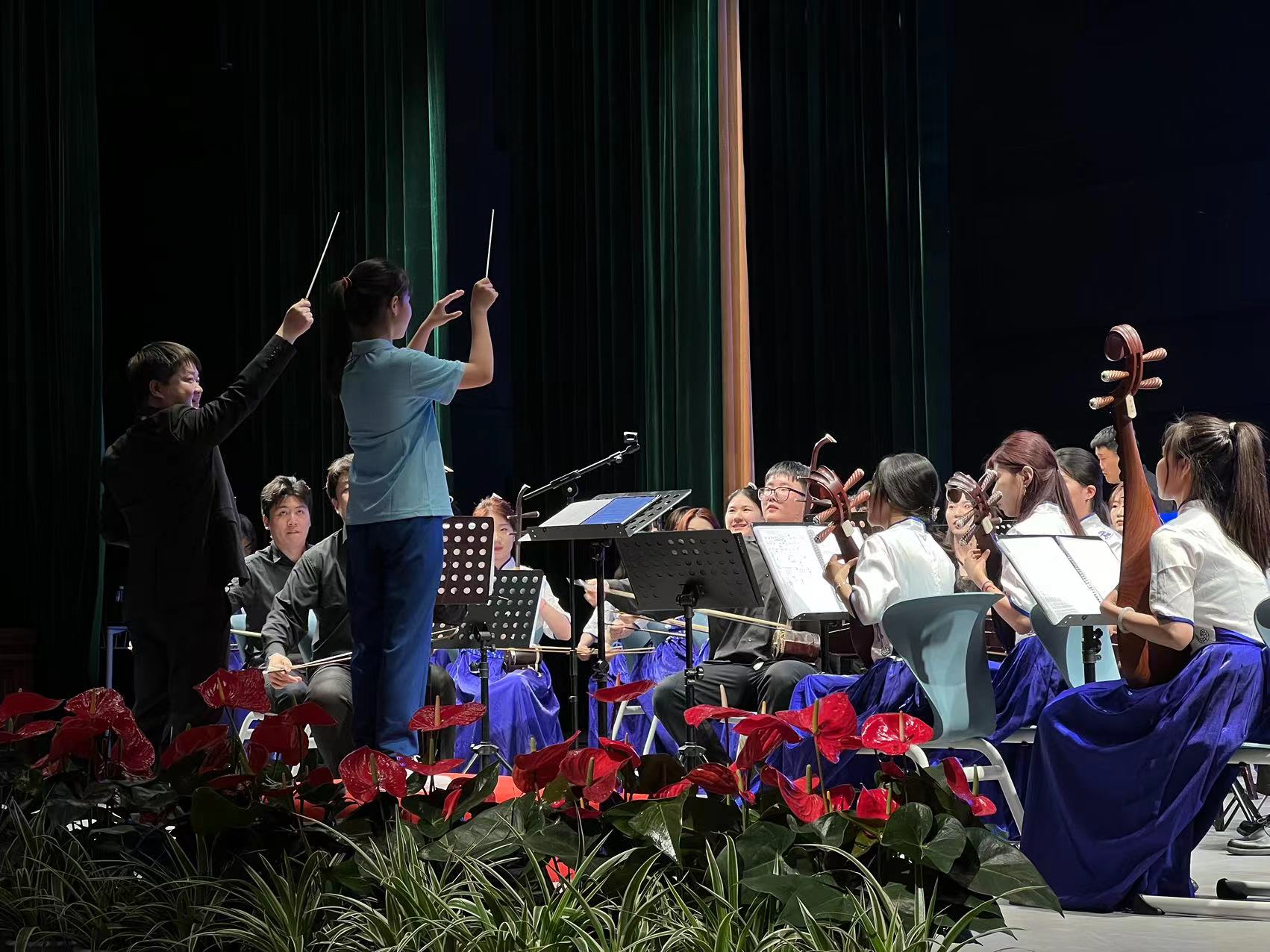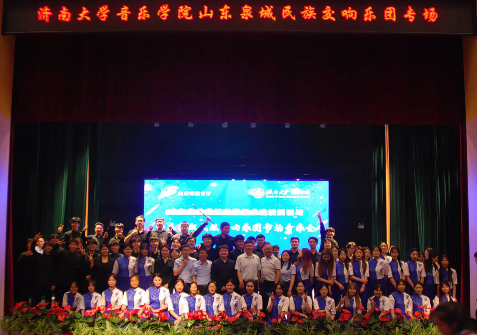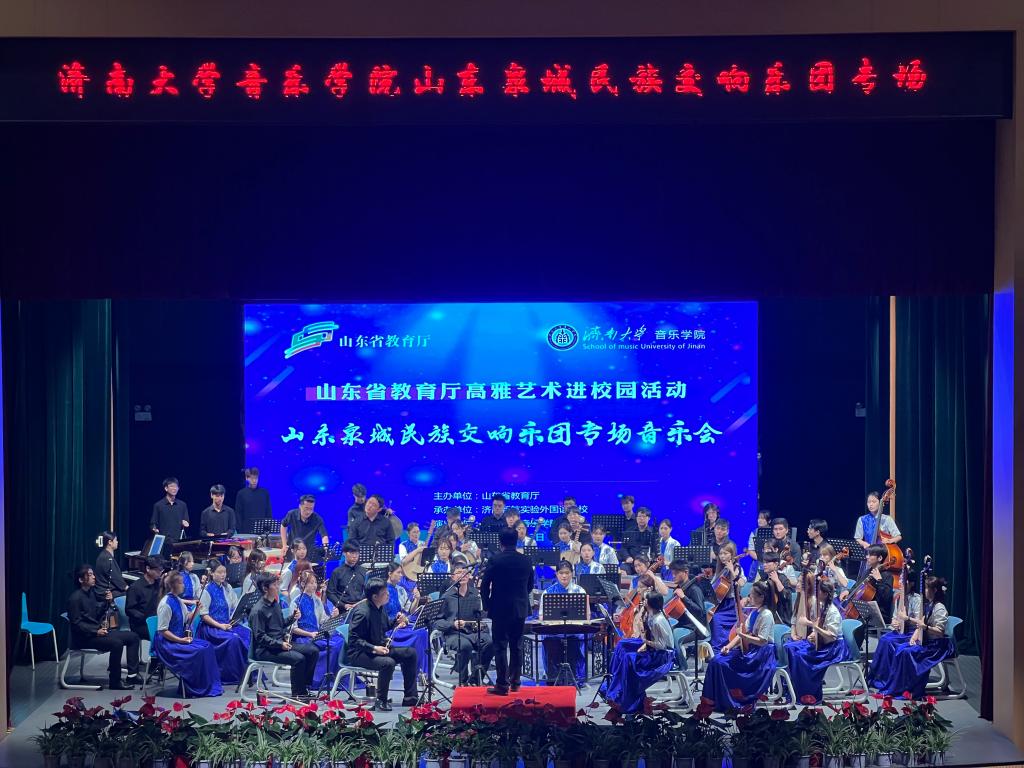 为全面贯彻落实党的二十大精神,深刻领会“两个结合”的重大意义,强化学校美育工作,6月3日晚,ok138cn太阳集团529山东泉城民族交响乐团70余人到济南新航实验外国语学校举办“高雅艺术进校园”专场音乐会。济南新航实验外国语学校校长刘新利、副校长张术磊、高中部校长吕秀亭、初中部校长李正华,ok138cn太阳集团529相关负责人及青年教师田浩出席活动,济南新航实验外国语学校部分教师代表和500余名学生现场观看音乐会。