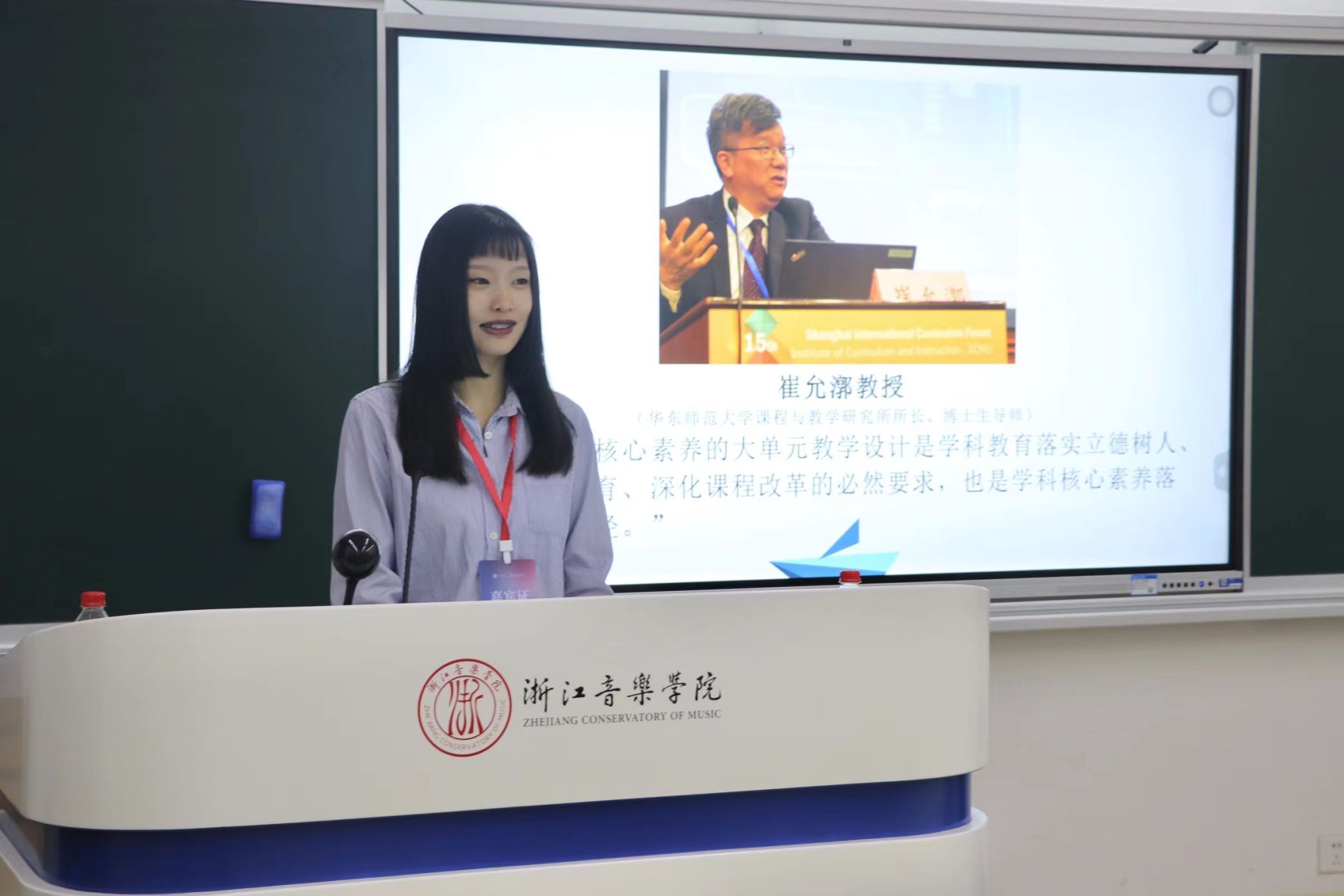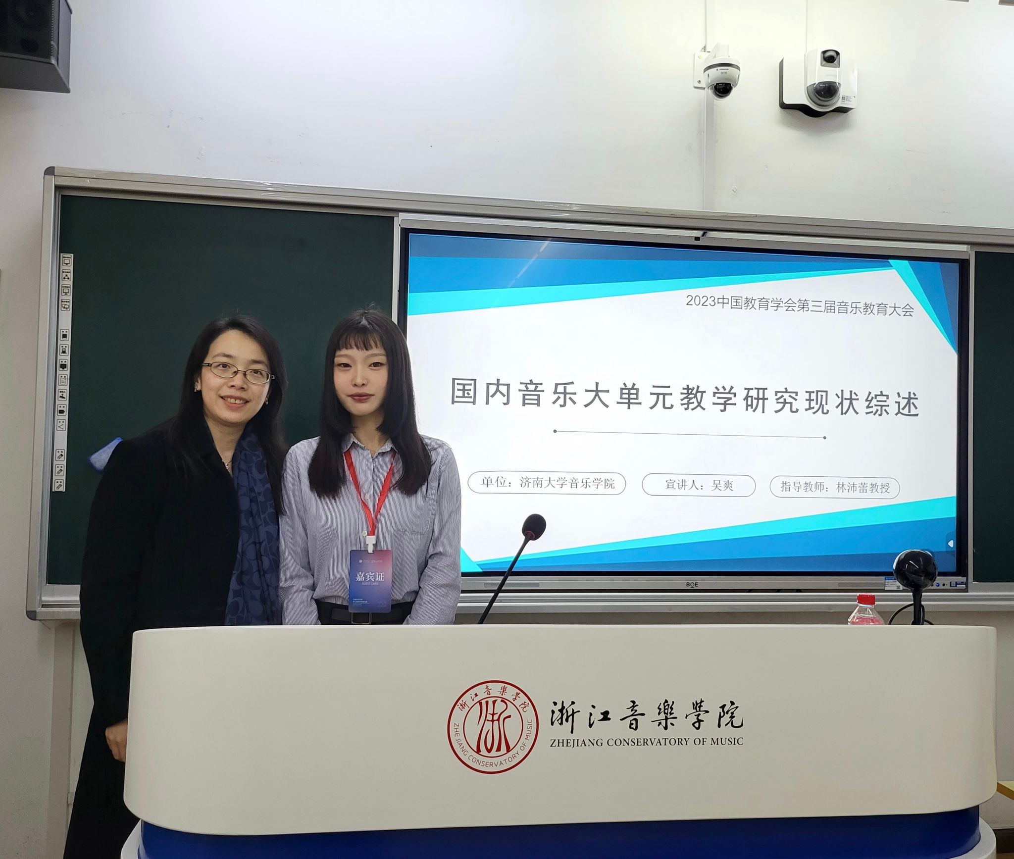 在此次音乐教育大会中,我院2021级音乐教育方向研究生吴爽投稿的论文《国内音乐大单元教学研究现状综述》经专家评审,在高校学生组论文评比中脱颖而出,受邀在高校学生论文宣讲专场中,进行主题发言。吴爽从国内音乐大单元教学的相关文献分布、理论研究与实践研究三方面研究现状进行梳理,提出未来研究要切实理清大单元概念、统建知识架构;增强理论研究、推动团队建设;推动音乐大单元教学模式落地实施等美好愿景。吴爽同学的选题新颖,逻辑清晰,获得与会代表与专家的高度肯定,显示了我院在音乐教育专业方向研究生人才培养方面的高水平教学成果。