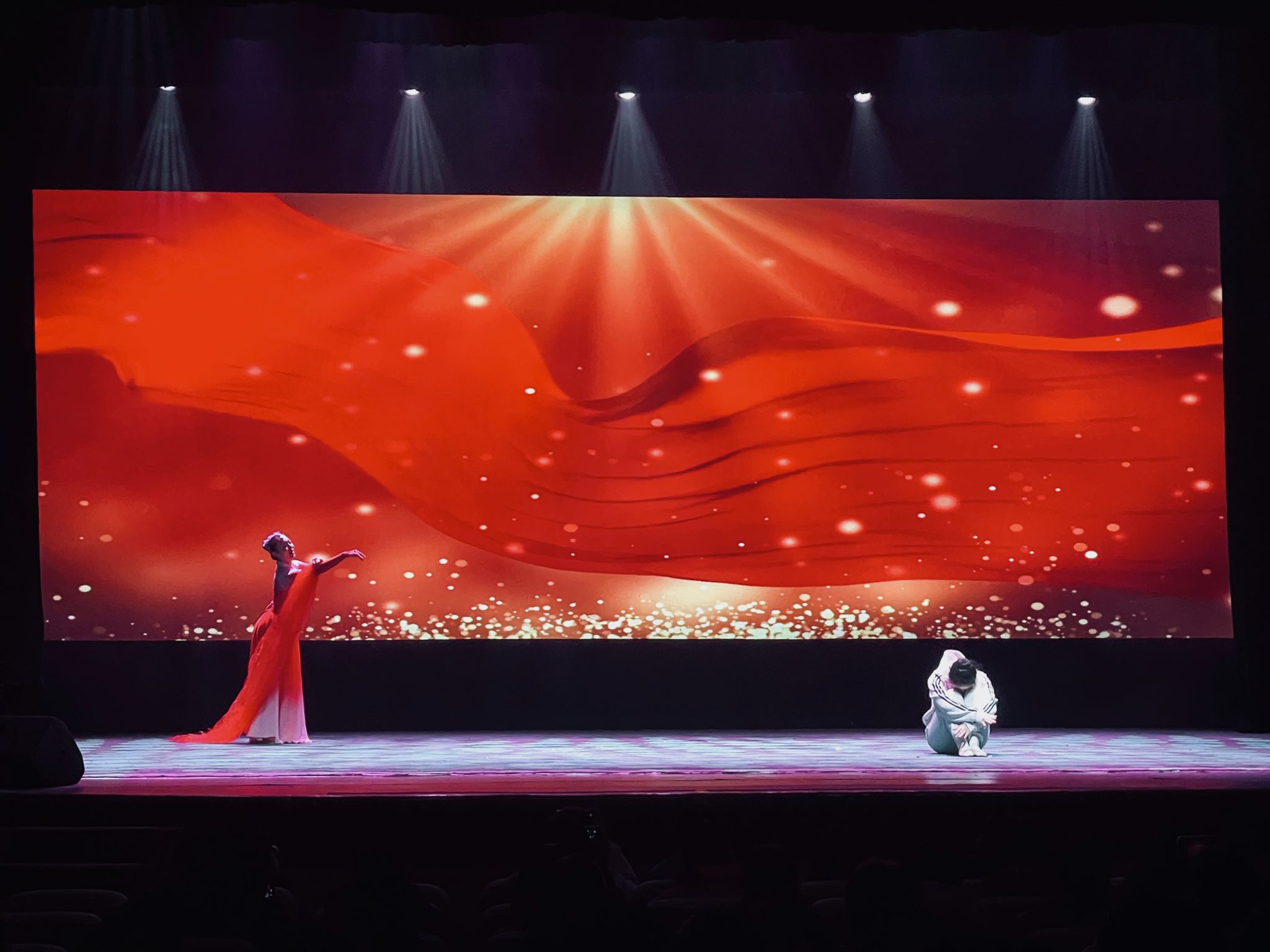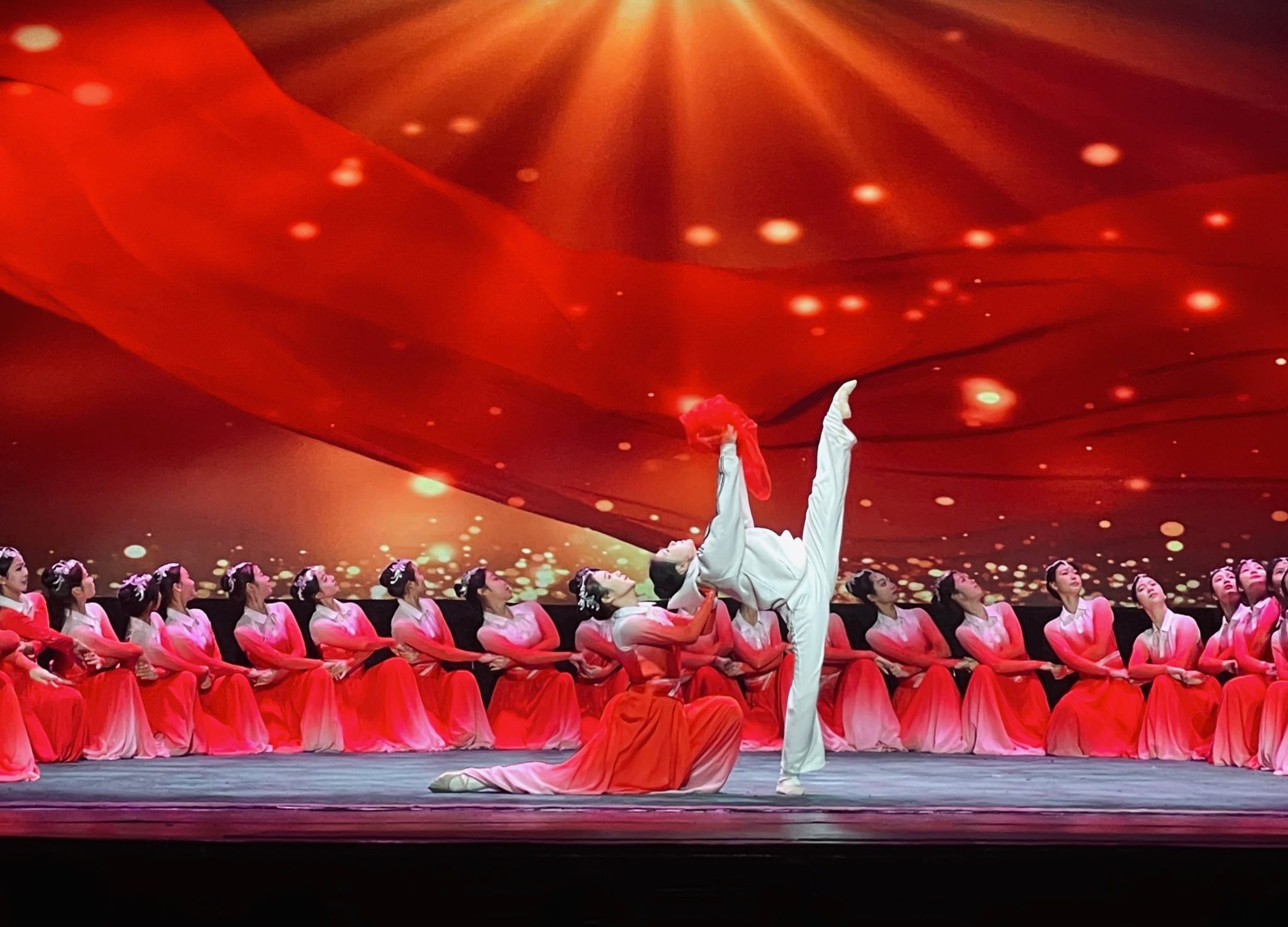 "爱你的人,就叫红丝带",随着音乐响起,舞台灯光倾泻而下,柔和的光芒包裹着起舞的少女们,轻捷地脚步不停旋转,红白的舞裙飘摇曳曳,领舞手中的红丝带随着衣袖的甩开,飘飘荡荡凌空而下,抒发着对艾滋病人的关爱与支持。