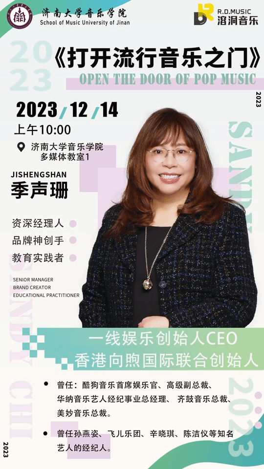 2023年12月14日,一线娱乐董事长、CEO,资深经理人季声珊老师为我院师生带来《打开流行音乐之门》学术讲座,本次活动由ok138cn太阳集团529与济南溶洞音乐共同举办,ok138cn太阳集团529现代音乐系承办。