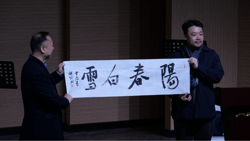 活动伊始,王建成副院长向大家介绍了男高音歌唱家李范柱的情况,对他的到来表示了热烈欢迎,并将书法作品《阳春白雪》赠予客人,李范柱老师表示了感谢并回赠了礼物。