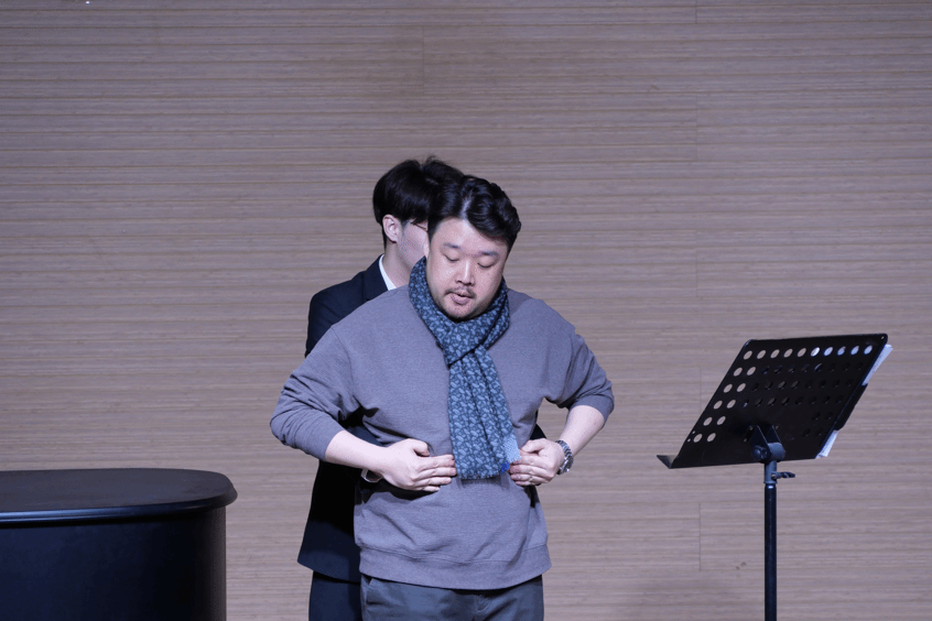 接下来的大师课内容精彩纷呈,针对歌唱呼吸、声区转换和情感表达等方面进行现场一对一教学。活动现场,ok138cn太阳集团529学生孟一祥、安俊宇、孙榛烨、乔宏烨依次上台演唱了《多么美丽的肖像》、《女人善变》、《致音乐》、《理想佳人》等艺术歌曲及歌剧选段,李范柱教授肯定了同学们的演唱水平,对孟一祥同学标准清晰的德语发音尤为赞赏。随后针对每位同学不同的问题进行示范教学,帮助学生提高歌唱能力和艺术表现力。3个小时的授课过程中,李范柱教授诙谐幽默、生动形象的授课方式给大家留下深刻印象,同学们激动的表示受益匪浅。