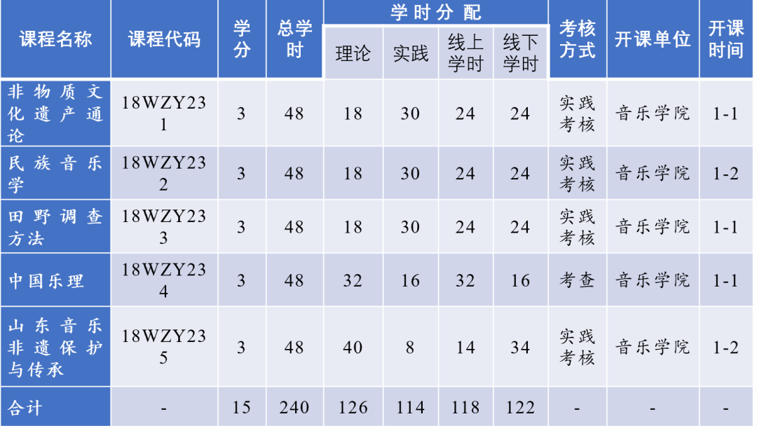 “音乐非遗学”微专业由5门课程组成,每门课程3学分,共计15学分。