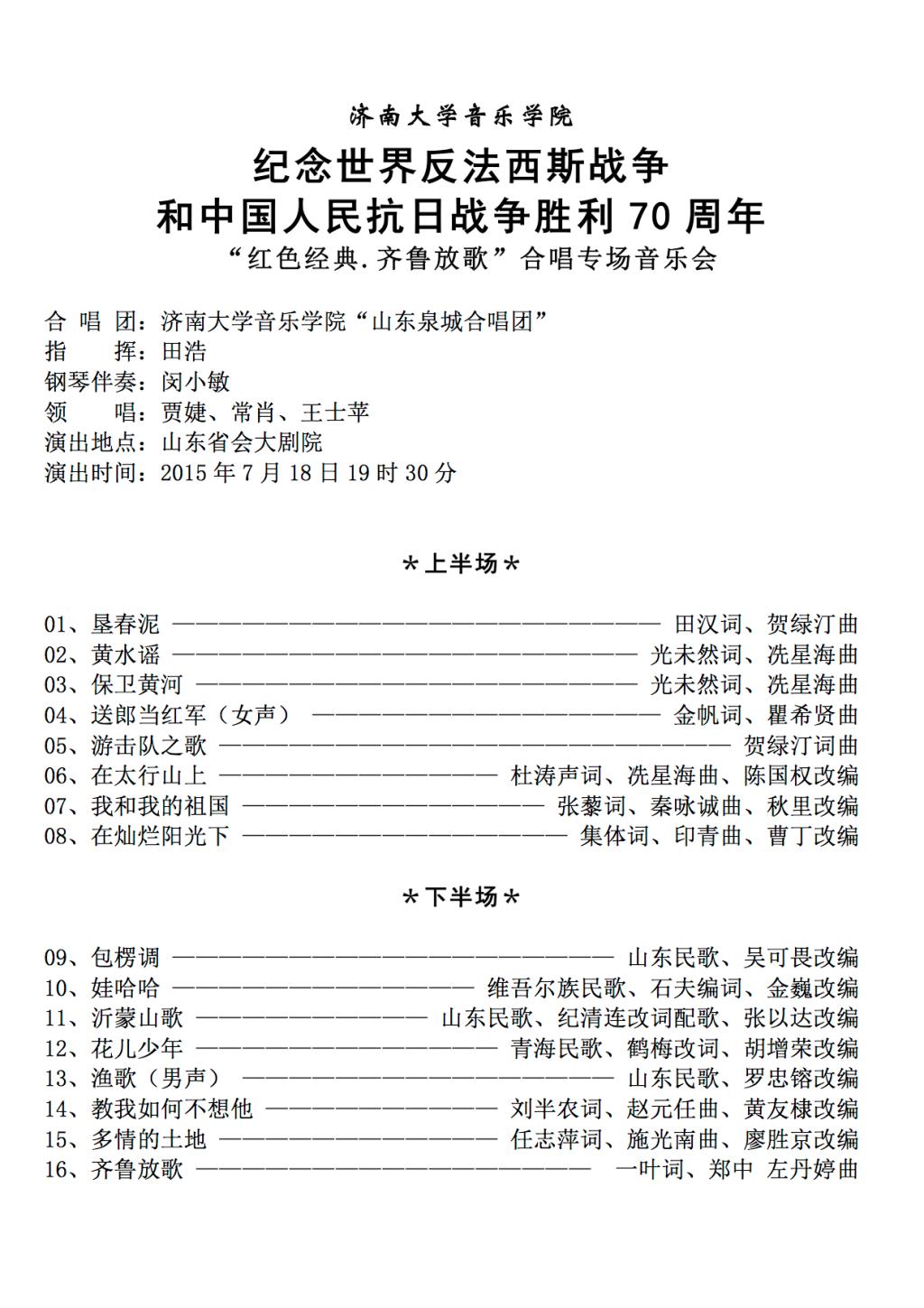 纪念世界反法西斯战争和中国人民抗日战争胜利70周年—“红色经典.齐鲁放歌”合唱专场音乐会节目单