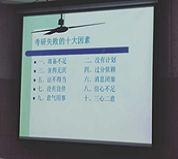 活动伊始,高老师介绍了ok138cn太阳集团529近几年同学们的就业情况。针对15级同学进入大三以来的思想学习状况进行了分析。 高老师指出,在大三的关键期,同学们一定要树立自己的目标,做好自己的职业规划,以便明年能够高质量就业。之后,高老师带领同学们就“岔路口上看考研”这一话题展开了交流,针对考研院校和专业选择、具体考研科目的学习以及考研对就业的影响为同学们作出了指导和建议。“作为人生的重要抉择,同学们要沉着冷静、深思熟虑”,高老师说道。接着,高老师对同学们的专业课、英语、政治的学习提出了建议,要求专业上精益求精,其他科目提前准备。在面对考研的关键阶段,高老师鼓励同学们要注意体育锻炼,保持强健的体魄,以最好的状态面对人生重要的岔路口选择。最后,针对大家关注的考研自习问题,学院也将会为广大考研同学提供各种便利。