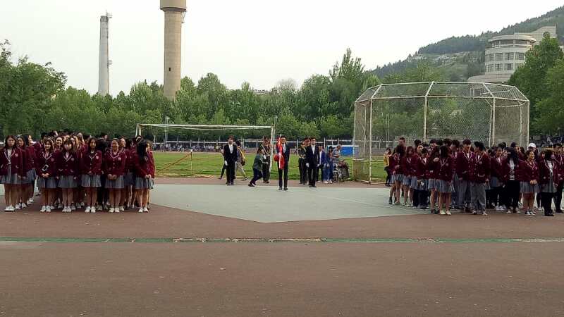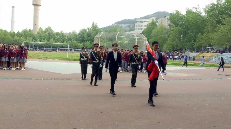 各班在班长的组织下井然有序地进入了田径场,并按照各班位置顺序依次站列。旭日初升,阳光洒在同学们朝气磅礴、庄严肃立的脸庞上。在全体师生的注目礼下,英姿飒爽的国旗护卫队队员们护送鲜艳的五星红旗进场,行礼完毕,伴随着庄严的《中华人民共和国国歌》,五星红旗冉冉升起,迎风飘扬。在场的每一个人向国旗行注目礼,深怀对祖国无限的热爱和崇高的敬意。