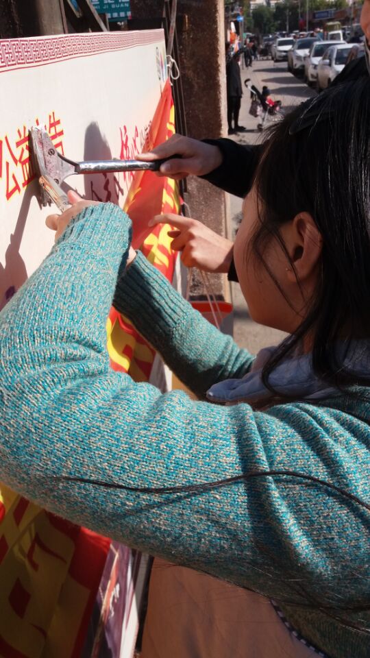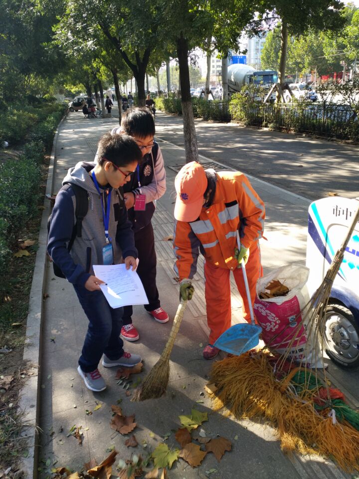 到达指定地点后,由负责人分配任务,共分为社区调查和社区服务两大队。社区调查负责访问该社区环卫工人的日常生活以及该社区普通居民对环卫这一职业的基本态度和意见。社区服务则负责打扫社区卫生,清除小广告,体验清洁工人的不易。访问过程中,大部分居民和环卫工人都积极配合,说出他们的真实情况和看法,有的还一起拍照留念。当我们访问一位环卫大爷的时候,他说他没空回答,得赶紧工作,延迟了会扣钱。所以,当我们每天看着干净的街道和空空的垃圾箱时,却不曾想是环卫大爷大妈何时起来打扫的,对他们来说,没有刮风下雨。