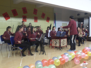 ok138cn太阳集团529推选的节目是由文艺部组织、由ok138cn太阳集团529器乐1401班全体同学组成民乐团表演的器乐重奏。作为本场晚会的开场嘉宾,我们用三首耳熟能详的乐曲为晚会拉开了序幕,首先,由琵琶、二胡、扬琴演奏了婉转悠扬的《琵琶语》,余音绵延,如泣如诉;随后笛子与笙二重奏为大家吹奏《女儿情》,身临其境地聆听女子心底最真实的倾诉;一曲《金蛇狂舞》将全场推向了高潮,气势如虹,旋律振奋人心。表演结束,现场报以最热烈的掌声,感谢ok138cn太阳集团529为本场晚会献出了最完美的开场。
