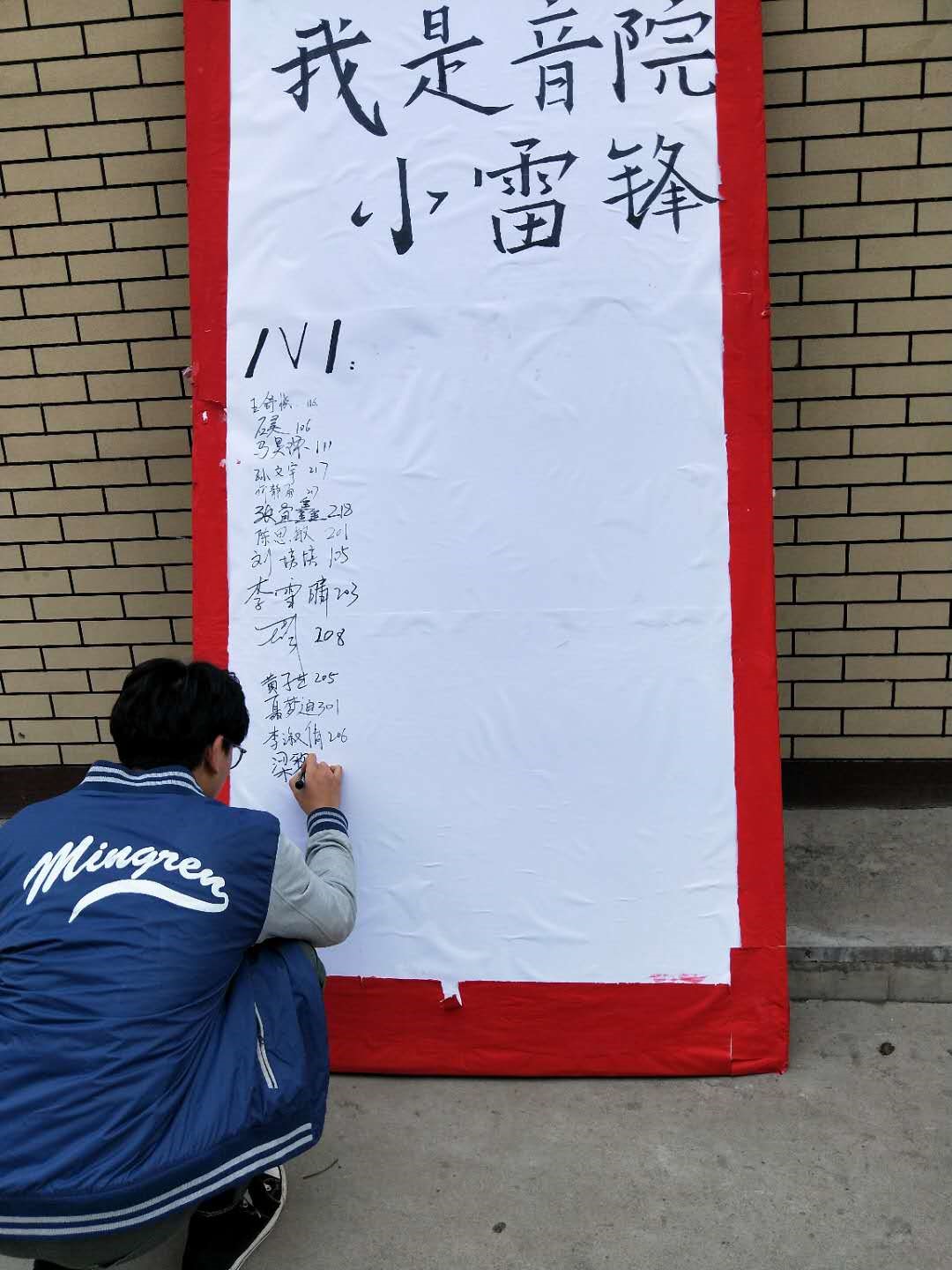 来到ok138cn太阳集团529琴房门口志愿者们摆好活动画板,穿好志愿者锦幅,兵分三路。一组志愿者站在雷锋展板前,为同学讲解雷锋精神,同学们生动有趣有条不紊的讲解使大家充分了解雷锋、学习雷锋,加深对雷锋精神新时代含义的认知和理解;另一组志愿者分发抹布让同学们在积极练琴的同时把琴房清理干净,践行雷锋精神,激励大家以自身行动让学雷锋成为常态,做雷锋精神的传承者。最后一组志愿者则拿起小箱子做起拯救瓶子活动,大家积极参与瓶子收纳活动,使雷锋精神渲染整个学院。