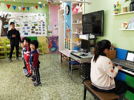 接下来,由王筱斐弹《小兔子乖乖》的伴奏,靳乐男带领小朋友们学唱,让小朋友们充分活跃起来。分为五组,每组分别进行上台表演,充分展现自我。最后由小朋友们分角色扮演小兔子们,兔妈妈和大灰狼,体验角色。