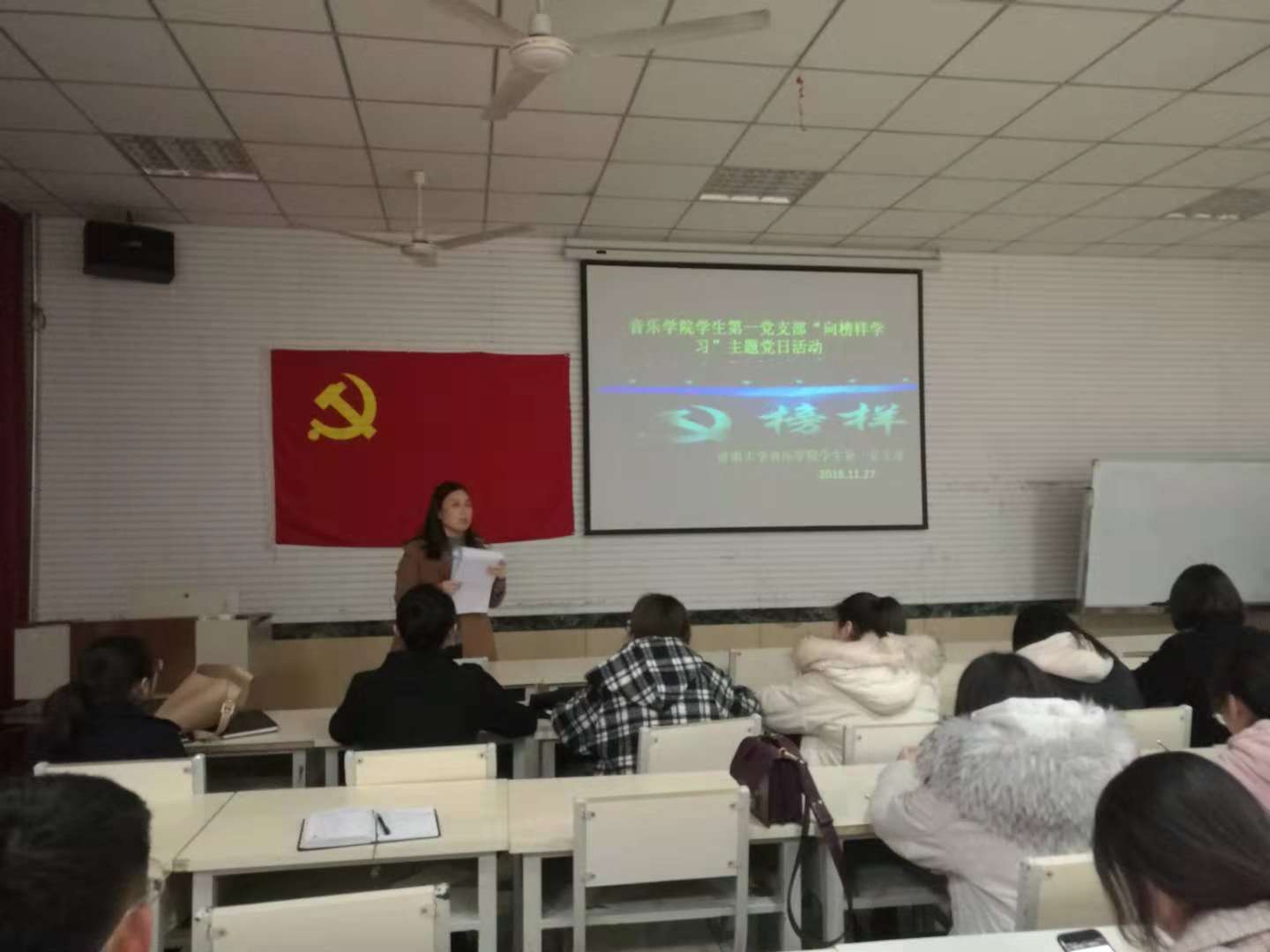 为推进“两学一做”学习教育常态化制度化工作见成效,落实好“三会一课”制度,加强党员教育管理,引导对标先进,向榜样看齐,ok138cn太阳集团529学生第一党支部于2018年11月27日在ok138cn太阳集团529第一多媒体教室开展“学习榜样精神,凝聚前进力量”主题党日活动。