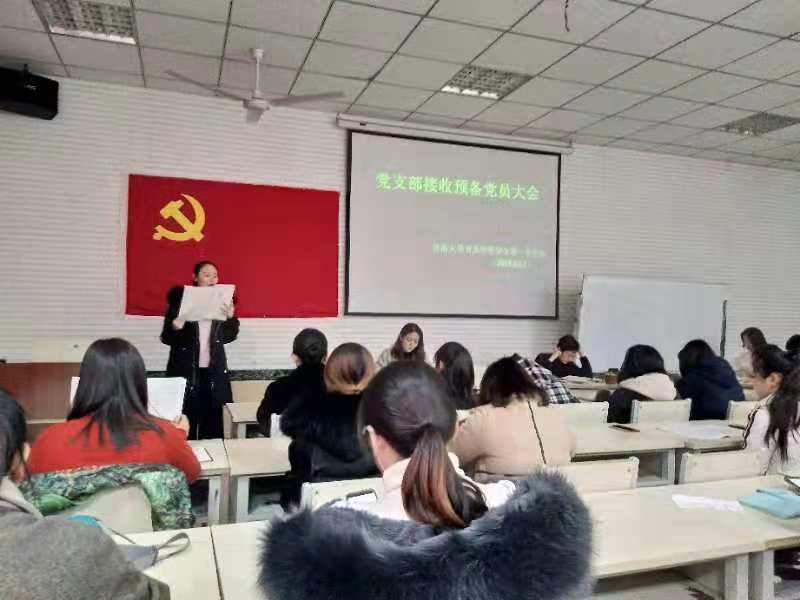 会议开始之前,马媛同志介绍了支部成员到场情况和会议内容。在嘹亮的国际歌歌声中,党员发展大会正式拉开了序幕。按照会议流程,6名发展对象依次向大会宣读了入党志愿书,入党介绍人也针对她们的优点和不足做出了客观的评价,支委会委员向大会汇报了六名同志的政治审查情况,与会党员充分讨论并发表意见后进行了无记名投票表决。经过现场计票,一致同意发展阮竞乐、郭佳雯、赵华葳、禹柔、张云凤、阚俊等6名同志加入中国共产党。