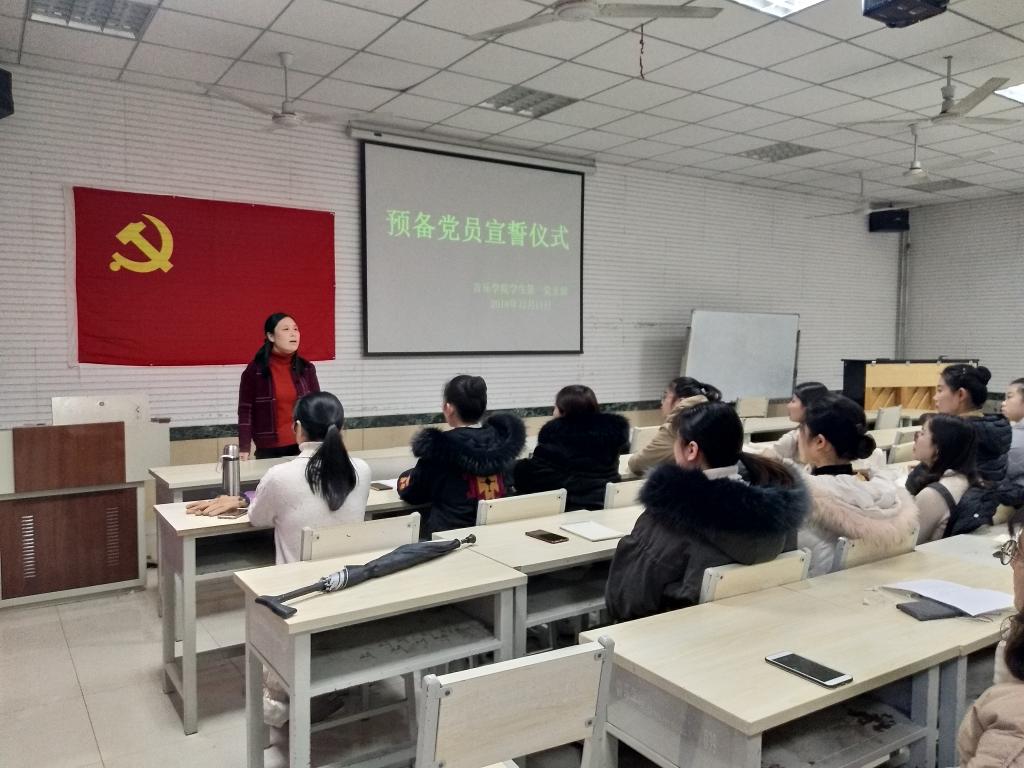 在全体起立奏唱国际歌之后,马媛老师宣布上级党组织的批复,并宣读具体名单。随后,由马媛老师作为领誓人,带领全体同志庄重宣誓。宣誓后,2016级舞蹈专业赵华葳同志作为新党员代表进行发言,她表达了在党旗下宣誓的激动心情和崇高的使命感,表示要用实际行动履行党旗下的誓言,时刻以党员标准严格要求自己,不断增强责任感与使命感。接着,2015级本科生王建丽同志代表老党员进行发言,她首先代表老党员向新入党的同志表示热烈的欢迎和衷心的祝贺,勉励新党员们从思想、学习、生活等各个方面提高自己,切实发挥党员的先锋模范作用。2017级器乐专业孙亚雯同志代表入党积极分子上台发言,她表示参加了宣誓仪式后深受触动,作为一名入党积极分子,要加强自身的思想政治建设,积极地投身于党的怀抱,时刻以党员的标准要求自己,对照党员的标准找出自己的差距,取长补短,完善自我,争取早日加入党组织。