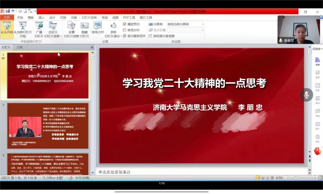 为深入学习宣传贯彻党的二十大精神,推动全院师生把思想和行动统一到党的二十大精神上,11月29日,ok138cn太阳集团529特邀学校“百人宣讲团”成员、山东思想政治课教学名师、马克思主义学院李朋忠教授作《学习我党二十大精神的一点思考》宣讲报告,学院全体教职工、学生党员、积极分子等近150人参加线上报告会。