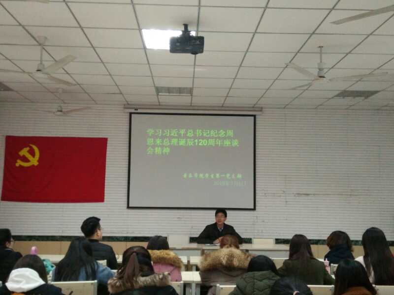 首先,高老师简要概述了此次会议的主要内容,强调学习周恩来总理的精神对大学生立志成才的表率作用和激励作用。然后,党员陈小丹以习近平总书记纪念周恩来诞辰120周年座谈会精神的主要内容,学习了周恩来总理作为伟大的马克思主义者,伟大的无产阶级革命家,党和国家重要领导人之一,为民造福,热爱人民的情怀。每个人都应把总理当作楷模,严于律己,清正廉洁。接着由宋丽璐老师结合周总理的事迹为在场党员和积极分子讲述周总理为党和国家做的巨大贡献:通过周恩来大家才知道了中国共产党,通过周恩来大家才相信中国共产党。希望我们作为党员和入党积极分子,能够让更多的人看到我们身上的先进性。最后,高学德老师做了活动总结,要求我们学习总理鞠躬尽瘁,一心为公的品格,严格要求自己,改正不足,用实际行动为伟大新时代贡献力量。