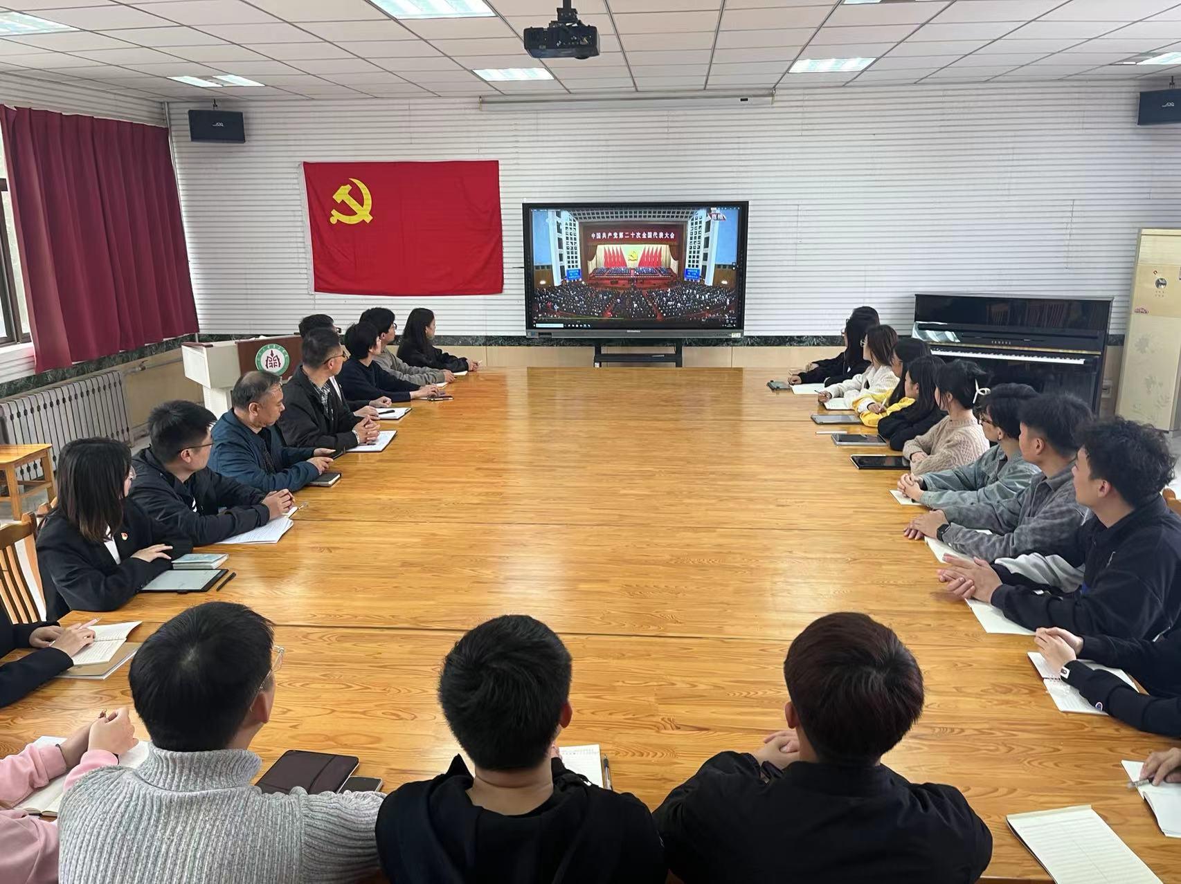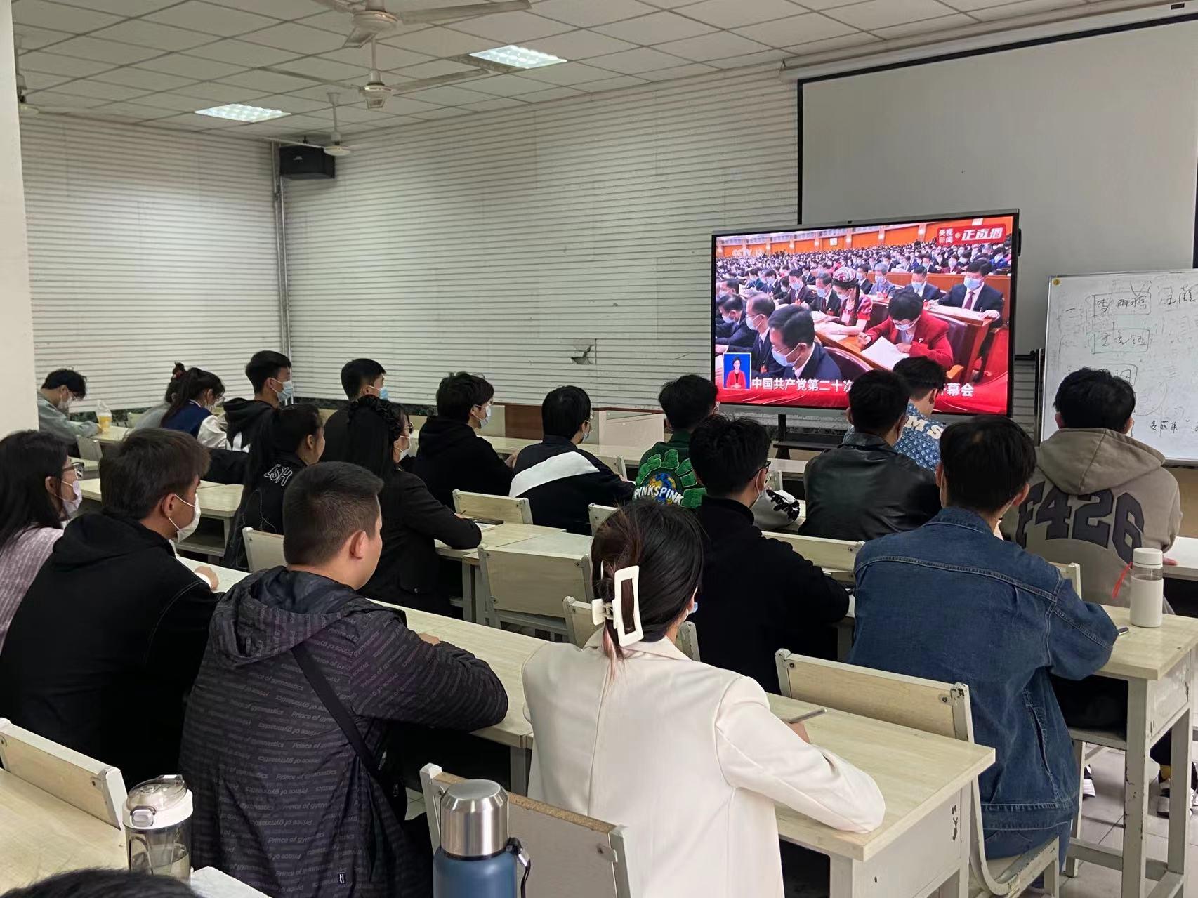 ok138cn太阳集团529党委理论学习中心组、党支部书记以及在校正式党员和预备党员集中在研讨课教室集中收看党的二十大开幕实况,认真聆听、学习习近平总书记的报告。
