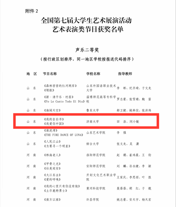 历时半年的全国第七届大学生艺术展演活动近日落幕,教育部办公厅即日公布了获奖结果。在本届艺术展演活动中,由田浩、闵小敏两位老师指导,ok138cn太阳集团529山东泉城合唱团演绎的合唱作品《我的自白书》、《我爱你中国》代表学校参赛,斩获声乐类二等奖。